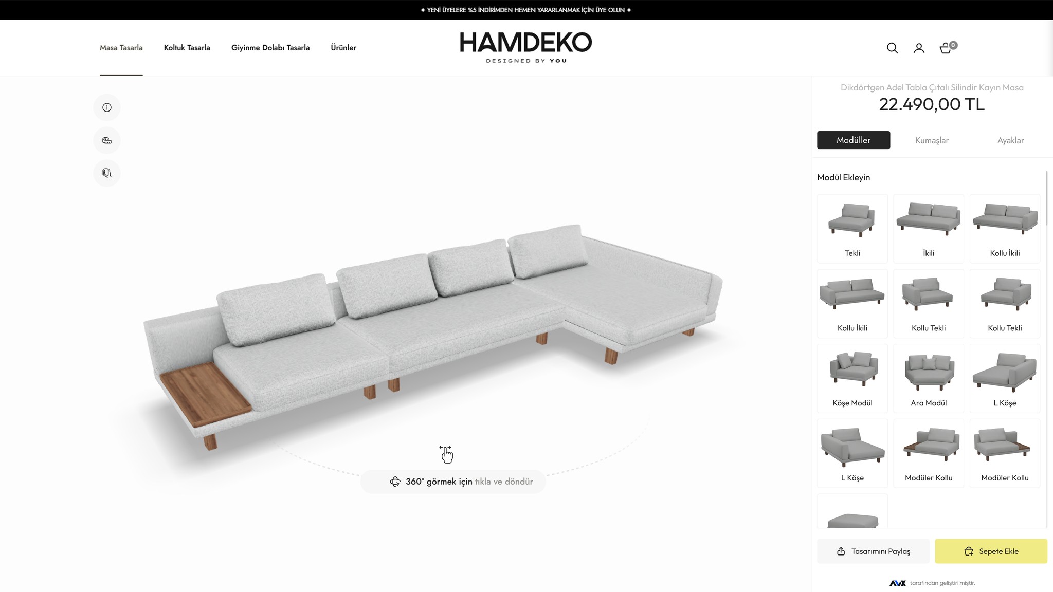 Her marka için özel yapılandırılan sistemde, ürünün varyasyonları (renk, materyal, ölçü, modül vb.) 3D model üzerinde tanımlanır. Kullanıcı seçim yaptığında model gerçek zamanlı olarak güncellenir.